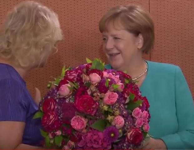 وظهرت ميركل في مقطع الفيديو وهي تتلقى باقة من الورود، خلال حضورها اجتماع مجلس الوزراء، وسط تصفيق الحضور، احتفالًا بإتمامها الـ 65 عامًا.
