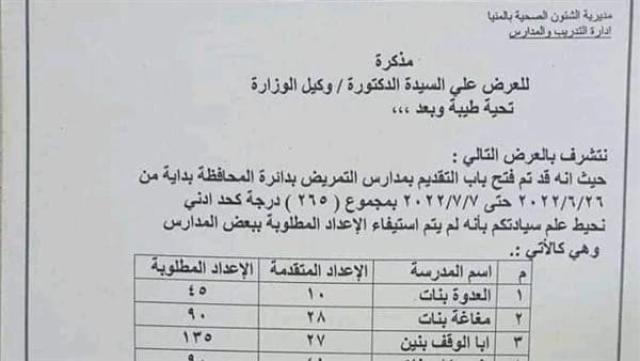 وأوضح أن مدارس التمريض العشر التي لم تستكمل الأعداد المطلوبة هي، العدوة للبنات وتقدم لها 10 والعدد المطلوب 45 طالبه ومغاغة للبنات وتقدم 28 والعدد المطلوب 90 وأبا الوقف للبنين بمغاغة تقدم 27 والعدد المطلوب 135 طالب وبني مزار للبنات تقدم 41 والعدد المطلوب 90 طالبة ومطاي للبنات تقدم 30 والمطلوب 90 ومطاي للبنين تقدم 28 والعدد المطلوب 45 وزهرة للبنين بمركز المنيا تقدم 13 والعدد المطلوب 60 طالب والمنيا للبنين تقدم 54 والعدد المطلوب 75 وأتليدم للبنين بمركز أبوقرقاص تقدم 25 والعدد المطلوب 45 طالب والأشمونين للبنين بمركز ملوي تقدم 34 والعدد المطلوب 90 طالب.