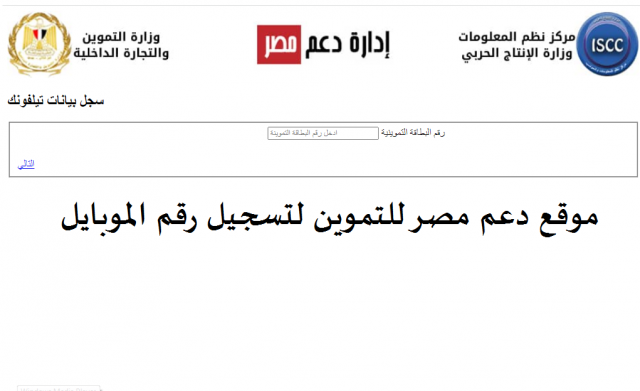 الدخول على موقع دعم مصر لتسجيل رقم الموبايل .. من هنـا تسجيل رقم بطاقة التموين الضغط على التالي ستنتقل إلى صفحة بها اسم صاحب البطاقة التموينية، وخانة آخرى لتسجيل رقم الموبايل اضغط على تسجيل رقم الهاتف ستظهر رسالة بأنه سيتم عملية مراجعة الرقم