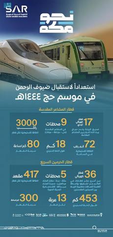 أعلنت الخطوط الحديدية السعودية " سار"، عن جاهزية قطار "الحرمين السريع" وقطار “المشاعر المقدسة" لنقل ضيوف الرحمن خلال موسم حج هذا العام 1444هـ، بكل سهولة ويسر؛ حيث تم تسخير كافة الإمكانيات للإسهام في تحسين تجربة الحاج عبر تنقله السلس في قطار الحرمين السريع الذي يعتبر أحد أسرع عشرة قطارات في العالم، حيث يربط الحرمين الشريفين ببعضهما مرورًا بمدينة الملك عبدالله الاقتصادية ومدينة جدة.