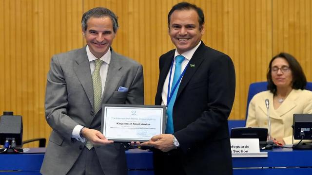 وقام بتسليم الشهادة مدير عام الوكالة للطاقة الذرية رفائيل قروسي، لممثل هيئة الرقابة النووية والإشعاعية جلوي بن ناصر القحطاني في مقر الوفد الدائم للمملكة في فيينا لدى الوكالة.