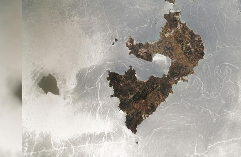 وتظهر في الصورة دوامة عملاقة في شرق جزيرة ميلوس. وهناك ميزة أخرى جديرة بالملاحظة وهي الخط الطويل المستقيم في الجزء السفلي الأيسر من الصورة، والذي يُرجح أن يكون أثرا لسفينة، وفقا لمرصد الأرض.