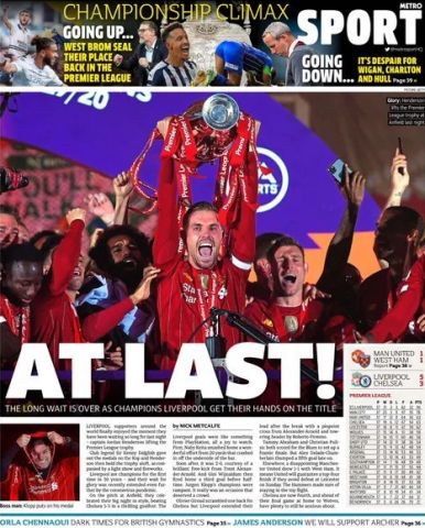 وأشارت صحيفة "مترو"، "النهاية، ليفربول يتربع على عرض قمة الدوري الإنجليزي والقائد هندرسون يرفع الكأس".