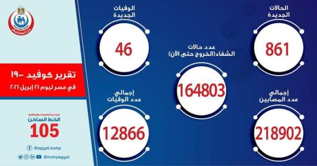 وأوضح الدكتور خالد مجاهد، مساعد وزيرة الصحة والسكان للإعلام والتوعية، والمتحدث الرسمي للوزارة، أنه تم تسجيل 861 حالة جديدة ثبتت إيجابية تحاليلها معمليًا للفيروس، وذلك ضمن إجراءات الترصد والتقصي والفحوصات اللازمة التي تُجريها الوزارة وفقًا لإرشادات منظمة الصحة العالمية، لافتًا إلى وفاة 46 حالة جديدة.