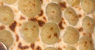 رصي البطاطس في طاجن فخار ثم ضعي الوايت صوص ورشى الجبنة على الوجة