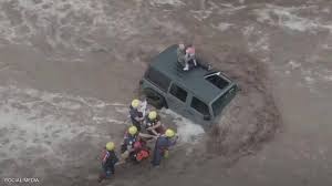 وأظهر مقطع فيديو نشرته "سكاى نيوز"، محاولة إنقاذ رجل وابنه الصغير كانوا يستقلون سيارة وجرفتها مياه الفيضانات الشديدة إلى مناطق واعرة، وحاول بعض المواطنين المساعدة فى انقاذ الأب وابنه بعد أن انقبلت سيارتهما في مياه الفيضانات وأصبحا محاصرين، وتقطعت بهم السبل، ليتم إخراجهما من الفيضانات في النهاية دون الإصابة بأذى.